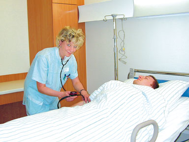 Ganz neu kann man in Prenzlau jetzt sein Baby per Wassergeburt auf die Welt bringen. Die elektro-nische Überwachung der Schwangerschaft in der Wanne sichert ein funkgesteuerter Sender, der ähnlich wie bei der Geburt im Bett, alle wichtigen Werte für den Arzt aufzeichnet. Die Vorteile für die werdende Mutter liegen auf der Hand erklärt Rothemann. Wir benötigen nur in sehr geringem Umfang Schmerzmittel. Die Dammschnittrate ist erheblich reduziert und Wehenmittel werden selten verabreicht. Die Gebärende spielt die aktive Rolle und genießt in der Wanne volle Bewegungsfreiheit. Sie fühlt sich geborgen. Ähnlich patientenfreun-dlich und innovativ kümmert man sich in den anderen Abteilungen des Krankenhauses um die Patienten. Mit Notaufnahme, Abteilungen für Inneres, Kinder, Chirurgie, Anästhesiologie und Intensivmedizin sind alle Fachrichtungen vorhan-den. Kleinere Eingriffe werden ambulant durchge-führt, dafür stehen eigene Fachleute zur Verfügung. Im Haus ist ebenfalls eine Physiotherapie, die hilft, wieder schnell auf die Beine zu kommen. Spezialbetreuung von Diabetikern, eine Kurzzeitpflege und der Sozialdienst runden den Gesundheitsservice des Kreiskrankenhauses Prenzlau ab.
