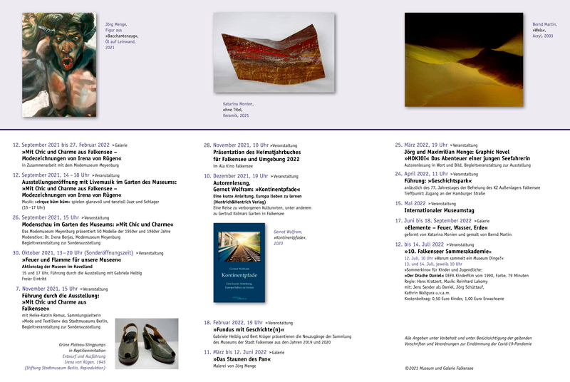 Museum und Galerie Falkensee öffnen ab den 16. März 2021 unter Berücksichtigung der aktuellen Hygienestandards und Abstandsregeln sowie mit zunächst eingeschränkten Öffnungszeiten wieder.