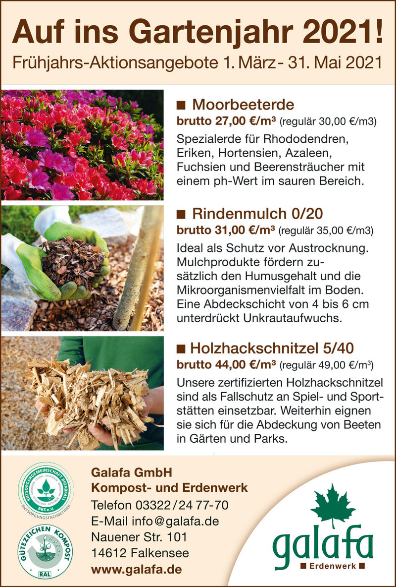 Auf ins Gartenjahr 2021, mit günstigen Preisen bei Galafa. Die „Galafa GmbH Kompost- und Erdenwerk“ bietet Frühjahrs-Aktionsangebote vom 1. März bis zum 31. Mai diesen Jahres, auf Moorbeeterde, Rindenmulch und Holzhackschnitzel.