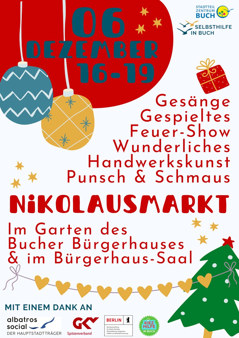 Am 5. Dezember 2025 findet von 16 bis 19 Uhr wieder der Nikolausmarkt rund um das Bucher Bürgerhaus statt. Neben Punsch, Speisen und Handwerkskunst erwartet die Besucher ein buntes Programm mit Feuer-Show, Musik und weihnachtlichen Aktionen im und vor dem Kiez-Café. Auch selbstgemachte Produkte können an eigenen Ständen angeboten werden. Die Anmeldung dafür ist per E-Mail möglich.