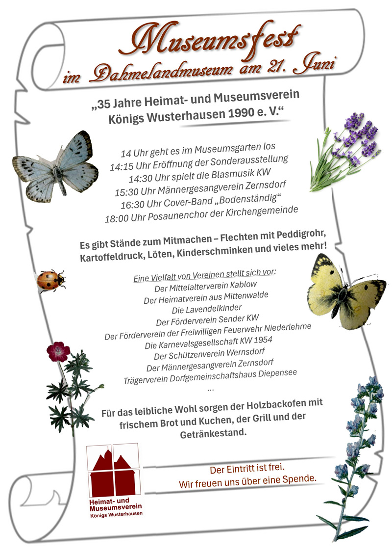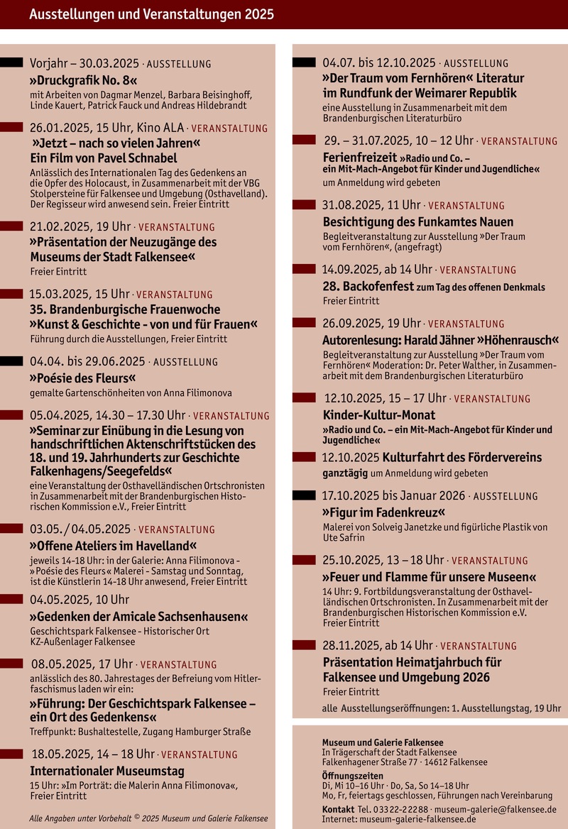 Zudem ist das „Heimatjahrbuch 2026 für Falkensee und Umgebung“ erschienen und für 8,50 Euro im Museumsshop sowie an weiteren Verkaufsstellen erhältlich.