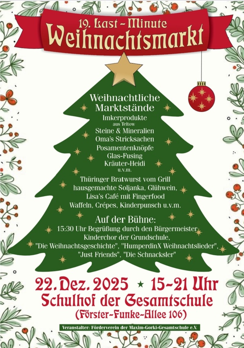 Am 22. Dezember von 15 bis 21 Uhr findet auf dem Schulhof der Maxim-Gorki-Gesamtschule in Kleinmachnow der 19. Last-Minute-Weihnachtsmarkt statt. Geboten werden handgemachte und regionale Produkte, ein weihnachtliches Bühnenprogramm mit Musik, Chor und Lesung, Weihnachtsmann und Engel sowie vielfältige Speisen und Getränke.